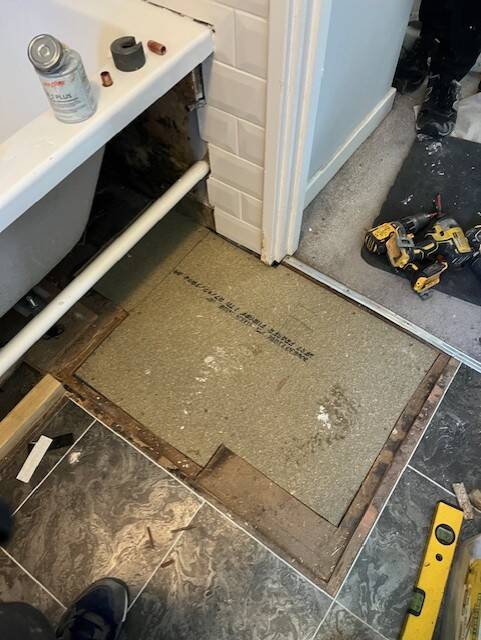 There had been a leak on the shower screen for a while and this had completely rotted the chipboard and ply sub floor.
