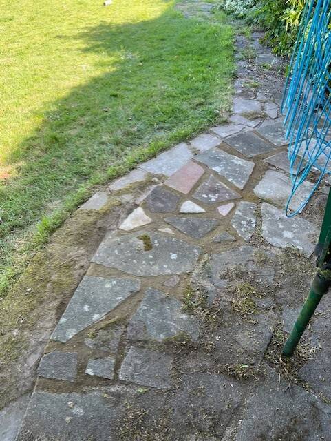 The front of this patio had sunk into the ground causing it to collapse, I investigated and found it had no footing. I stripped it back, dug and concreted a footing. I cemented in the first layer of slabs before installing the top layer and pointed in to match the existing rustic look.